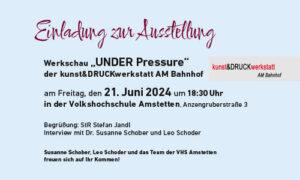 Wir, die Volkshochschule Amstetten, laden Sie herzlich zur Ausstellung Werkschau „UNDER Pressure“ der kunst&DRUCKwerkstatt AM Bahnhof am 21.06.2024 um 18:30 weiterlesen